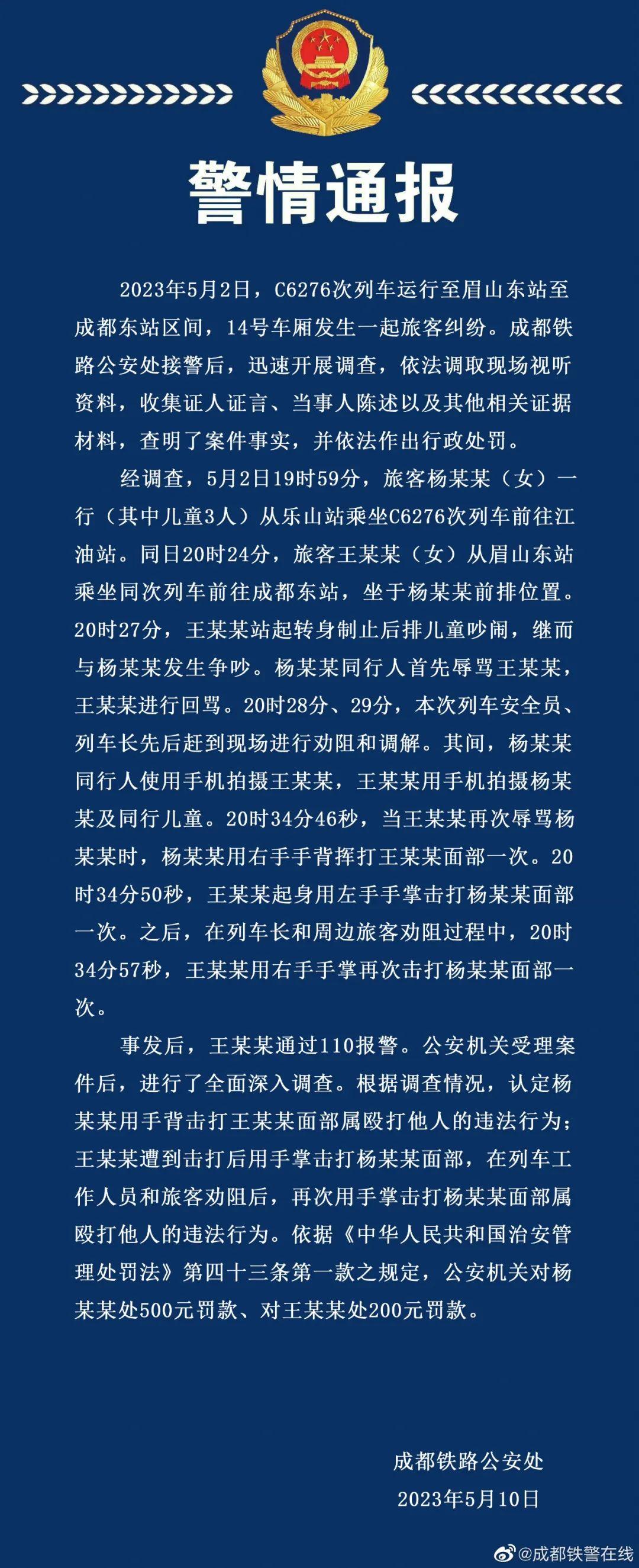 面對網(wǎng)絡質疑,5月10日,成都鐵路公安處官方微博“@成都鐵警在線”發(fā)布警情通報稱,根據(jù)調查情況,認定楊某某用手背擊打王某某面部屬毆打他人的違法行為;王某某遭到擊打后用手掌擊打楊某某面部,在列車工作人員和旅客勸阻后,再次用手掌擊打楊某某面部屬毆打他人的違法行為。警方據(jù)此認為雙方均違反治安管理處罰法,并處以不同金額的罰款。隨后,四川廣播電視臺“@四川觀察”、封面新聞公布現(xiàn)場視頻,涉及列車車廂監(jiān)控、列車長巡檢記錄儀、當事雙方手機所拍視頻等多個角度,直觀地呈現(xiàn)雙方發(fā)生爭執(zhí)繼而爆發(fā)肢體沖突的過程。網(wǎng)絡討論熱度再次攀升,微博上形成“#高鐵掌摑事件雙方曾多次對罵#”“#高鐵被打女子2次打人被認定違法#”“#王某某被打后兩次掌摑楊某某#”等多個話題,不少網(wǎng)民一改之前支持王某某的立場。但部分網(wǎng)民仍從情感角度出發(fā),質疑官方對視頻進行二次剪輯,認為警方苛求被打者還擊的間隔時間有失公平。