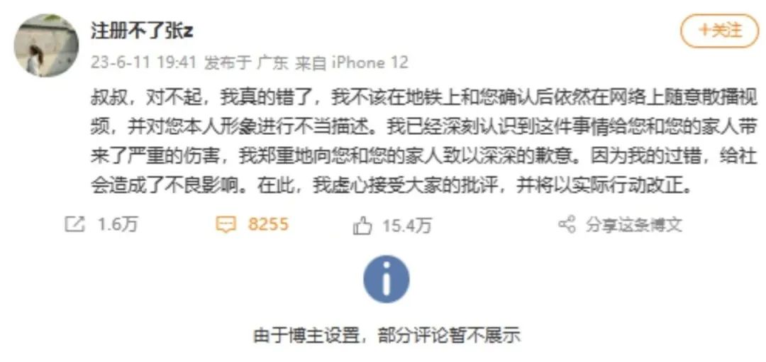 6月11日,被懷疑偷拍男子的兒子鄧某通過(guò)《南方都市報(bào)》發(fā)聲,稱父親是農(nóng)民工,當(dāng)天坐地鐵想在廣州轉(zhuǎn)轉(zhuǎn),未曾想到被當(dāng)做“猥瑣男”發(fā)到網(wǎng)上。他希望涉事女子公開(kāi)道歉,否則將選擇起訴。該表態(tài)獲得大量網(wǎng)民支持。當(dāng)日,鄧某陪同父親到廣州鷺江站派出所報(bào)警,張某致歉,雙方再次達(dá)成和解。鄧某表示,她還是一名學(xué)生,公開(kāi)道歉就好,不想影響她太多。當(dāng)日19時(shí)許,“@注冊(cè)不了張z”發(fā)博致歉,這條微博引發(fā)網(wǎng)民評(píng)論8000余條,但張某關(guān)閉了評(píng)論功能,僅顯示一條為其“站臺(tái)”的精選留言,很快有網(wǎng)民發(fā)現(xiàn)該賬號(hào)為張某小號(hào)。這一“操作”徹底激怒網(wǎng)民,有網(wǎng)民諷刺稱:“用專業(yè)優(yōu)勢(shì)帶風(fēng)向,發(fā)現(xiàn)‘失手’后先大號(hào)道歉,再小號(hào)帶節(jié)奏,不愧是傳媒學(xué)院的高材生。”如潮的質(zhì)疑聲中,張某所在的四川大學(xué)也遭遇壓力,不斷有網(wǎng)民頻繁催促校方處置此事。6月12日,四川大學(xué)再次回應(yīng)稱仍在調(diào)查,但否認(rèn)網(wǎng)傳將要開(kāi)除涉事女生的信息,輿情熱度持續(xù)走高,并于6月14日觸頂。
