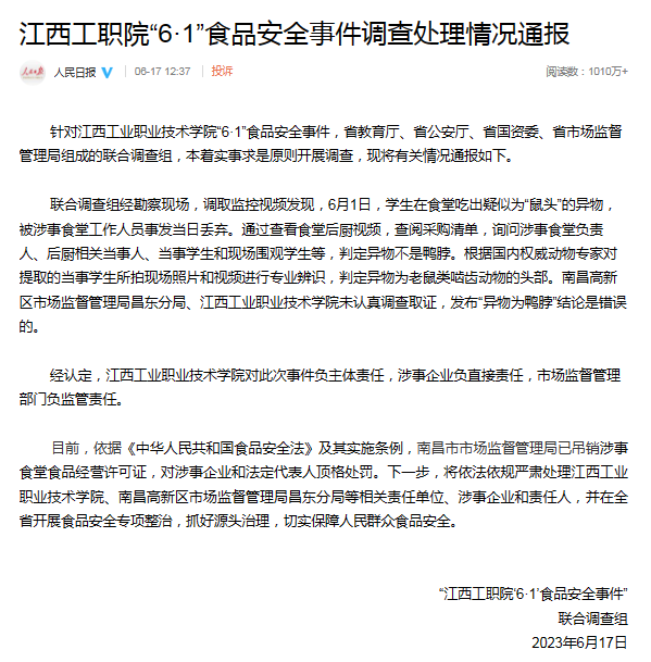 6月2日,據(jù)“@沸點視頻”稱,6月1日,網(wǎng)曝江西工業(yè)職業(yè)技術(shù)學(xué)院學(xué)生吃飯吃出來老鼠頭。據(jù)抖音短視頻顯示,一男子告知食堂工作人員吃出來老鼠頭,工作人員表示“是鴨肉”。報道稱,涉事的學(xué)校餐飲公司南昌市菁禾餐飲工作人員表示“已經(jīng)看到視頻了,會去調(diào)查核實處理”。隨后“@頭條新聞”等賬號轉(zhuǎn)載該新聞,部分網(wǎng)民留言評論表示“不信”,并調(diào)侃稱“說是鴨肉的那個讓他吃掉”。