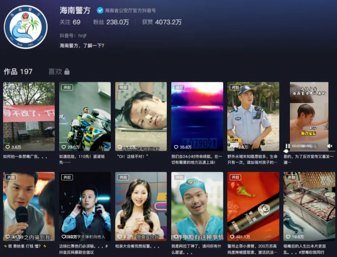 豐富的傳播渠道和多樣的共創(chuàng)模式可以說是“海南警方”短視頻成功破圈的基礎(chǔ)。在傳播渠道方面,“海南警方”拍攝的短視頻會(huì)依據(jù)內(nèi)容形式,首先投放在抖音、快手以及微信視頻號等平臺,通過擴(kuò)充社交媒體傳播渠道,最大范圍內(nèi)汲取公域流量,打好用戶底盤。除了以短視頻平臺為核心的投放策略外,“海南警方”還利用其他平臺作為引流渠道,如以日常工作宣傳為主的今日頭條和微博上,“海南警方”發(fā)布對應(yīng)的視頻合集,嘗試突破平臺壁壘,最大程度吸引網(wǎng)民注意力。在創(chuàng)作方式上,“海南警方”根據(jù)視頻內(nèi)容與其他賬號合作,如《這錢不對》和《禁毒版盜夢空間》兩部作品,由于涉及反邪教和禁毒題材,“海南警方”分別與中國反邪教和海南禁毒合作拍攝,這種基于宣傳主旨達(dá)成的合作模式可以幫助賬號有效拓展分眾渠道,觸達(dá)更多用戶。“海南警方”還有部分視頻是與下級公安的合作,包括昌江警方、澄邁警方等,這一方面可以發(fā)揮海南警方的虹吸效應(yīng),聚合更多流量助推宣傳效果,另一方面也可以反哺弱勢賬號,打造傳播矩陣,為普法宣傳開辟更多通路。