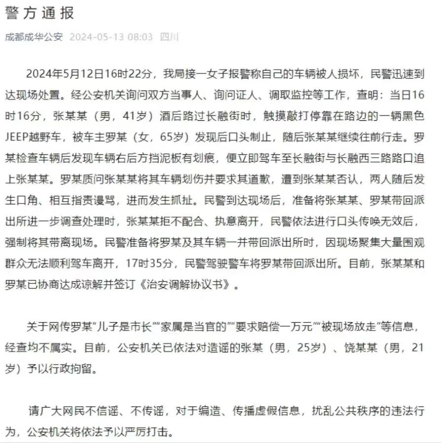 5月13日8時(shí)許,成都市成華區(qū)警方發(fā)布通報(bào)介紹事發(fā)過(guò)程,稱5月12日16時(shí)許,張某某(男,41歲)酒后觸摸敲打??吭诼愤叺牧_某(女,65歲)的車,雙方發(fā)生口角抓扯。張某某拒不配合、執(zhí)意離開(kāi),民警依法進(jìn)行口頭傳喚無(wú)效后,強(qiáng)制將其帶離現(xiàn)場(chǎng)。民警準(zhǔn)備將羅某及其車輛一并帶回派出所時(shí),因現(xiàn)場(chǎng)聚集大量圍觀群眾無(wú)法順利駕車離開(kāi)。目前,雙方已協(xié)商達(dá)成諒解并簽訂調(diào)解書(shū),網(wǎng)傳羅某“要求賠償一萬(wàn)元”“被現(xiàn)場(chǎng)放走”等信息均不屬實(shí),公安機(jī)關(guān)已依法對(duì)造謠的張某和饒某某予以行政拘留。該通報(bào)被光明網(wǎng)、“@四川日?qǐng)?bào)”等媒體轉(zhuǎn)發(fā)后帶動(dòng)輿情升溫,“#警方通報(bào)男子摸車被索賠1萬(wàn)#”等熱搜話題閱讀量累積近8000萬(wàn)次。部分網(wǎng)民調(diào)侃車主“神通廣大”,吐槽“以后停在路邊的車別亂摸”;有網(wǎng)民對(duì)通報(bào)內(nèi)容表示懷疑,追問(wèn)為何“把吉普車圍起來(lái)”等,還有網(wǎng)民呼吁公開(kāi)現(xiàn)場(chǎng)監(jiān)控。“@作家劉小?!薄癅無(wú)心簡(jiǎn)影”等大V則力挺成都警方,反問(wèn)“成都市長(zhǎng)快60的人了,怎么可能有個(gè)65歲的媽”“難道不是因?yàn)楝F(xiàn)場(chǎng)有人煽動(dòng)造成人員聚集,怕現(xiàn)場(chǎng)失控才來(lái)了這么多警察嗎”。