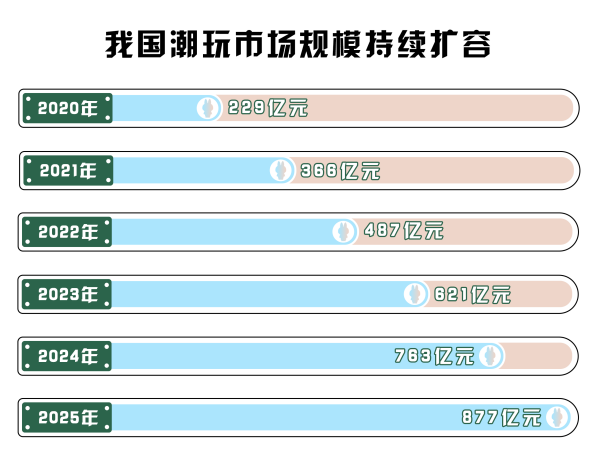 潮玩市場規(guī)模持續(xù)擴(kuò)張奠定基礎(chǔ)。據(jù)《2025-2030年中國潮流玩具深度分析及發(fā)展前景研究預(yù)測報(bào)告》數(shù)據(jù)顯示,2020-2024年中國潮流玩具市場規(guī)模已經(jīng)從229億元攀升至763億元,且預(yù)計(jì)2025年突破877億元。潮玩市場擴(kuò)容,大批消費(fèi)者持續(xù)涌入,為培育LABUBU這樣的優(yōu)質(zhì)IP提供了肥沃的土壤。