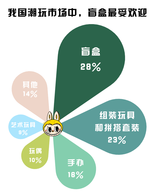 盲盒屬性為消費(fèi)者提供情緒價(jià)值。數(shù)據(jù)顯示,我國潮玩市場中,盲盒是最大的細(xì)分市場,占比約28%。
