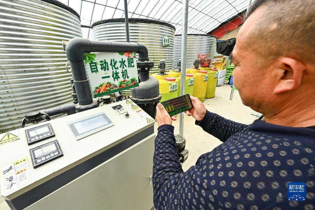 現(xiàn)代設(shè)施農(nóng)業(yè)示范基地的管理人員通過手機控制自動化水肥一體機。記者 丁磊 攝