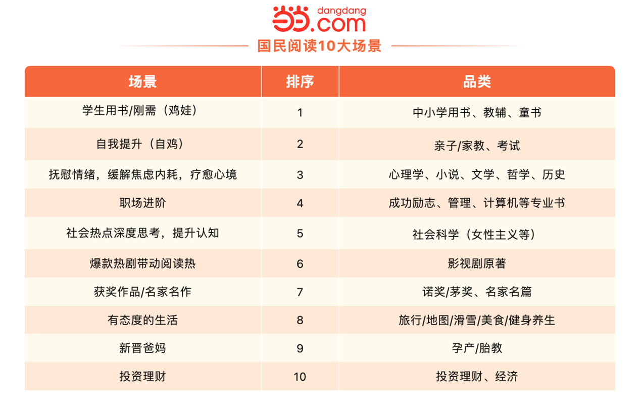 閱讀是大腦的有氧運動,卻自帶阻力。在現(xiàn)實生活中,想不起來閱讀,想起來閱讀不知道讀什么書,是當下閱讀推廣面臨的主要問題。結(jié)合品類和爆款書的消費趨勢,當當網(wǎng)發(fā)布“國民閱讀10大場景”,以期提醒更多讀者想起閱讀,想起書。