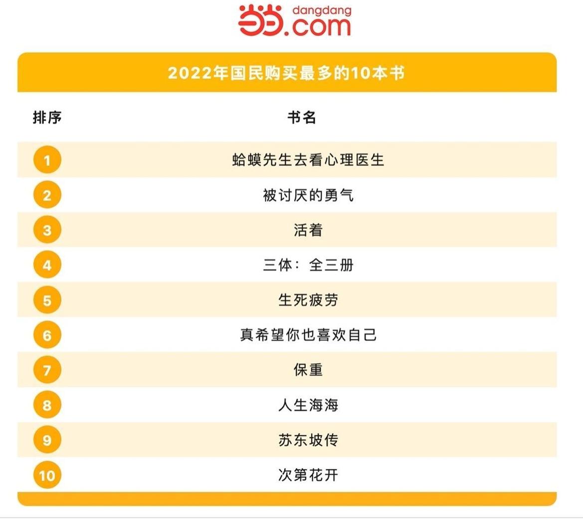 2022年國民購買最多的10本書中,心理學、療愈類、成功勵志、嚴肅文學、科幻書籍霸榜。邊躺邊卷是年度閱讀主題,一方面讀者通過自助心理類,心靈療愈類、嚴肅文學類書籍對抗精神內(nèi)耗,尋求自洽;一方面又通過成功勵志類、科幻類等書籍尋求積極、振奮的心態(tài)。