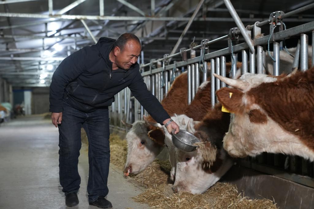 格其葉樂(lè)圖在牛棚里給牛投喂顆粒飼料(受訪者供圖)