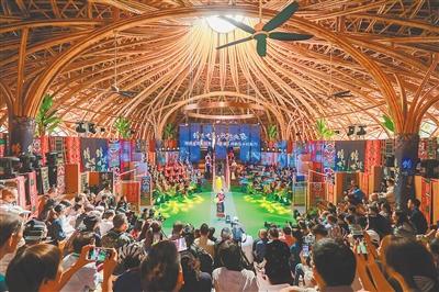 劇場外的廣場上,非遺展示展演時(shí)刻不停。當(dāng)?shù)剡x派的黎族傳統(tǒng)紡染織繡技藝、海南苗族傳統(tǒng)刺繡蠟染技藝、黎族藤編技藝、黎族竹木器樂、黎族民歌、海南苗族民歌、黎族共同舞、黎族舂米舞、海南苗族盤皇舞、海南苗族招龍舞等項(xiàng)目的傳承人持續(xù)進(jìn)行展示展演。