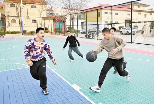 3月16日,寧晉縣黃兒營西村青少年在村里的民樂廣場籃球場打籃球。記者 王偉宏 攝