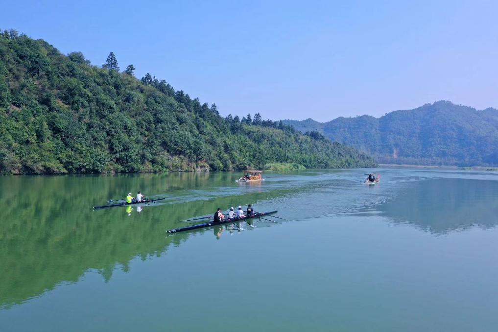 游客在平垣秘境景區(qū)內,體驗賽艇、木筏漂流等項目。新華社發(fā)