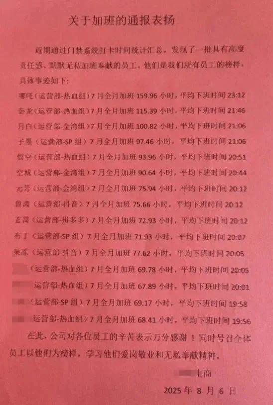 近日,某網(wǎng)友在社交平臺貼出了一則某電商公司《關(guān)于加班的通報(bào)表揚(yáng)》。表揚(yáng)信中顯示,有員工7月份加班159.96小時(shí),平均下班時(shí)間為23點(diǎn)12分。