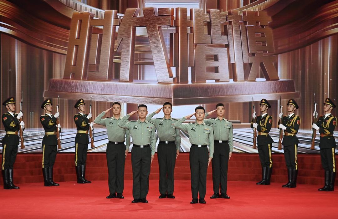 圖為在“時代楷?!卑l(fā)布儀式上,陸軍第八十二集團(tuán)軍某旅“劉老莊連”官兵代表敬禮。張永進(jìn) 攝