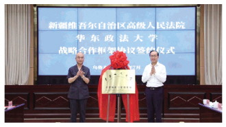 本報(bào)訊 記者余東明 近日,華東政法大學(xué)與新疆維吾爾自治區(qū)高級(jí)人民法院簽署戰(zhàn)略合作框架協(xié)議,簽約儀式在自治區(qū)高院舉行。華東政法大學(xué)黨委副書記、校長(zhǎng)葉青和新疆維吾爾自治區(qū)高院黨組成員、副院長(zhǎng)王浪濤代表雙方簽署戰(zhàn)略合作框架協(xié)議,共同為“自治區(qū)高級(jí)人民法院 華東政法大學(xué)法學(xué)研究與實(shí)踐基地暨法院系統(tǒng)高層次人才進(jìn)修基地”揭牌,標(biāo)志著華東政法大學(xué)與新疆法院共建法律人才培養(yǎng)機(jī)制的工作取得新的進(jìn)展,對(duì)于推動(dòng)全區(qū)創(chuàng)新法治人才培養(yǎng)和提升法治專門隊(duì)伍革命化、正規(guī)化、專業(yè)化、職業(yè)化水平具有重要意義。
