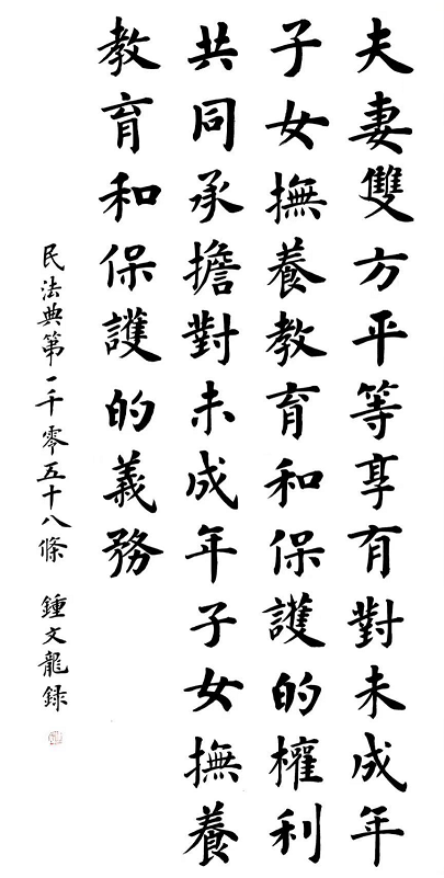 2020年7月11日,司法部普法與依法治理局和法制日報社共同主辦了“書·法”系列活動。鐘文龍先生應邀書寫民法典第一千零五十八條: “夫妻雙方平等享有對未成年子女撫養(yǎng)、教育和保護的權(quán)利,共同承擔對未成年子女撫養(yǎng)、教育和保護的義務。”因其作品周正雅致而頗受好評。