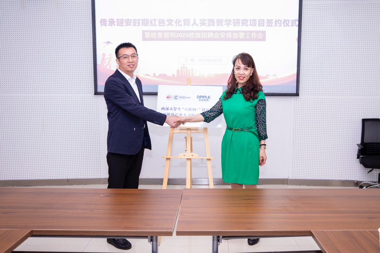 (西北政法大學(xué)新聞傳播學(xué)院(藝術(shù)學(xué)院)副院長與歐普照明股份有限公司陜西分公司副總經(jīng)理王世新為“西部大學(xué)生互聯(lián)網(wǎng)+大學(xué)生創(chuàng)新創(chuàng)業(yè)數(shù)字新媒體產(chǎn)業(yè)人才孵化實訓(xùn)基地”揭牌)