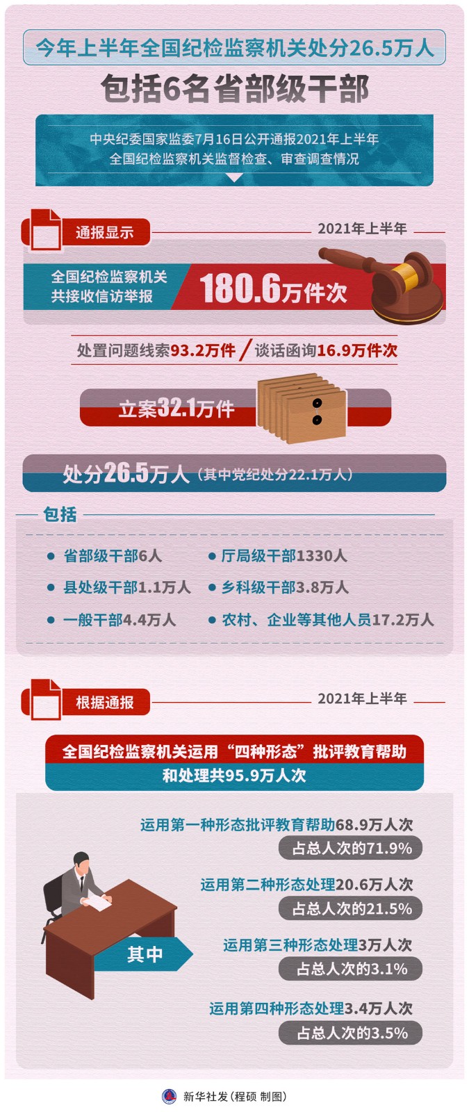 圖表:今年上半年全國紀(jì)檢監(jiān)察機關(guān)處分26.5萬人 包括6名省部級干部