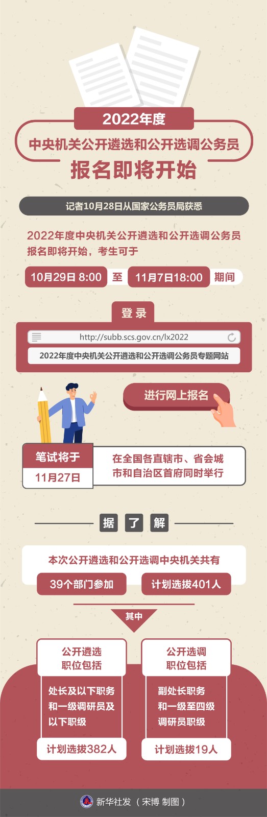 記者10月28日從國家公務員局獲悉,2022年度中央機關(guān)公開遴選和公開選調(diào)公務員報名即將開始,考生可于10月29日8:00至11月7日18:00期間,登錄“2022年度中央機關(guān)公開遴選和公開選調(diào)公務員專題網(wǎng)站”(http://subb.scs.gov.cn/lx2022)進行網(wǎng)上報名,筆試將于11月27日在全國各直轄市、省會城市和自治區(qū)首府同時舉行。