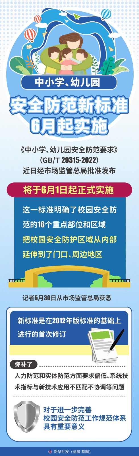 《中小學(xué)、幼兒園安全防范要求》(GB/T 29315-2022)近日經(jīng)市場監(jiān)管總局批準(zhǔn)發(fā)布,將于6月1日起正式實施。這一標(biāo)準(zhǔn)明確了校園安全防范的16個重點部位和區(qū)域,把校園安全防護區(qū)域從內(nèi)部延伸到了門口、周邊地區(qū)。