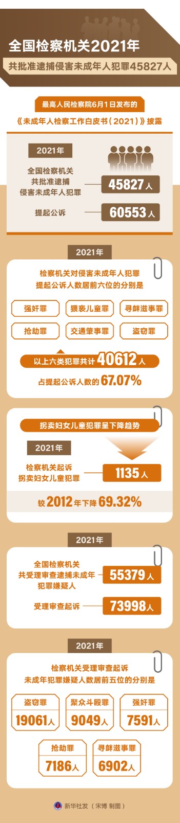 最高人民檢察院6月1日發(fā)布的《未成年人檢察工作白皮書(2021)》披露,2021年,全國檢察機關(guān)共批準逮捕侵害未成年人犯罪45827人,提起公訴60553人。