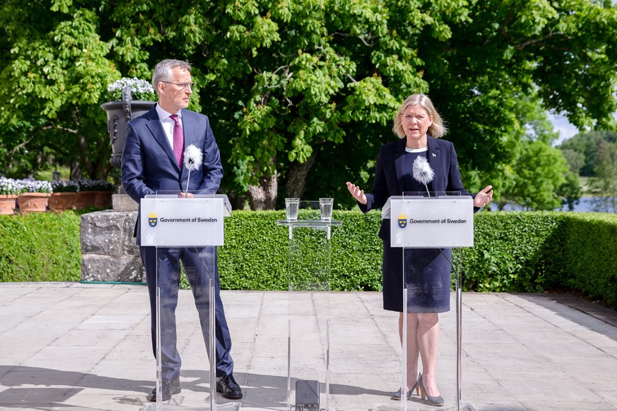 6月13日,瑞典首相安德松(右)與到訪的北約秘書長斯托爾滕貝格在瑞典首都斯德哥爾摩以西約120公里的哈普松德首相夏季莊園出席新聞發(fā)布會。