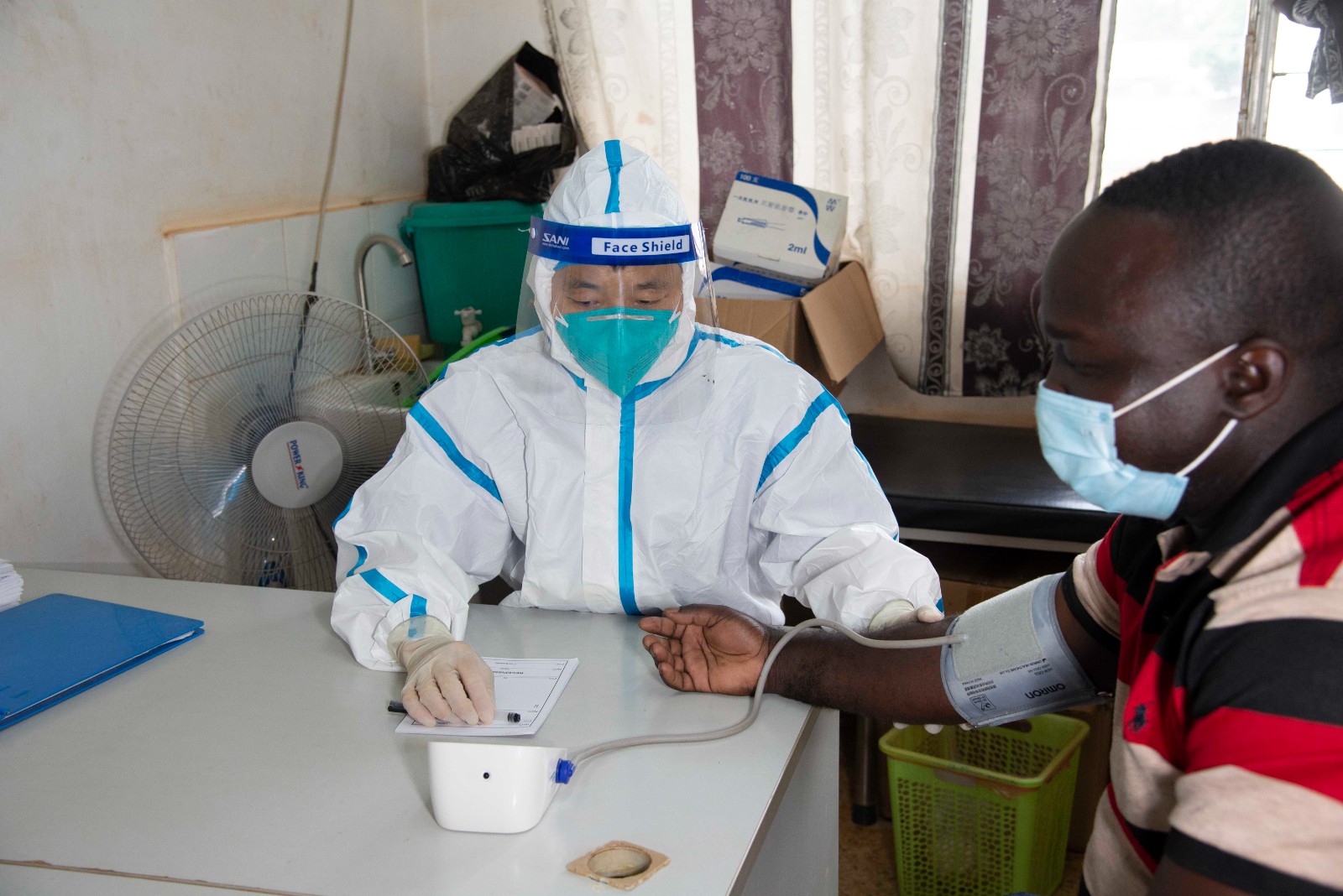 6月9日,在中非共和國首都班吉,中國醫(yī)療隊醫(yī)生為病人測血壓。