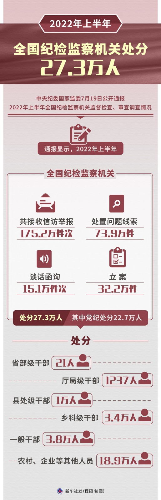 中央紀委國家監(jiān)委7月19日公開通報2022年上半年全國紀檢監(jiān)察機關(guān)監(jiān)督檢查、審查調(diào)查情況。2022年上半年,全國紀檢監(jiān)察機關(guān)共立案32.2萬件,處分27.3萬人,包括省部級干部21人。