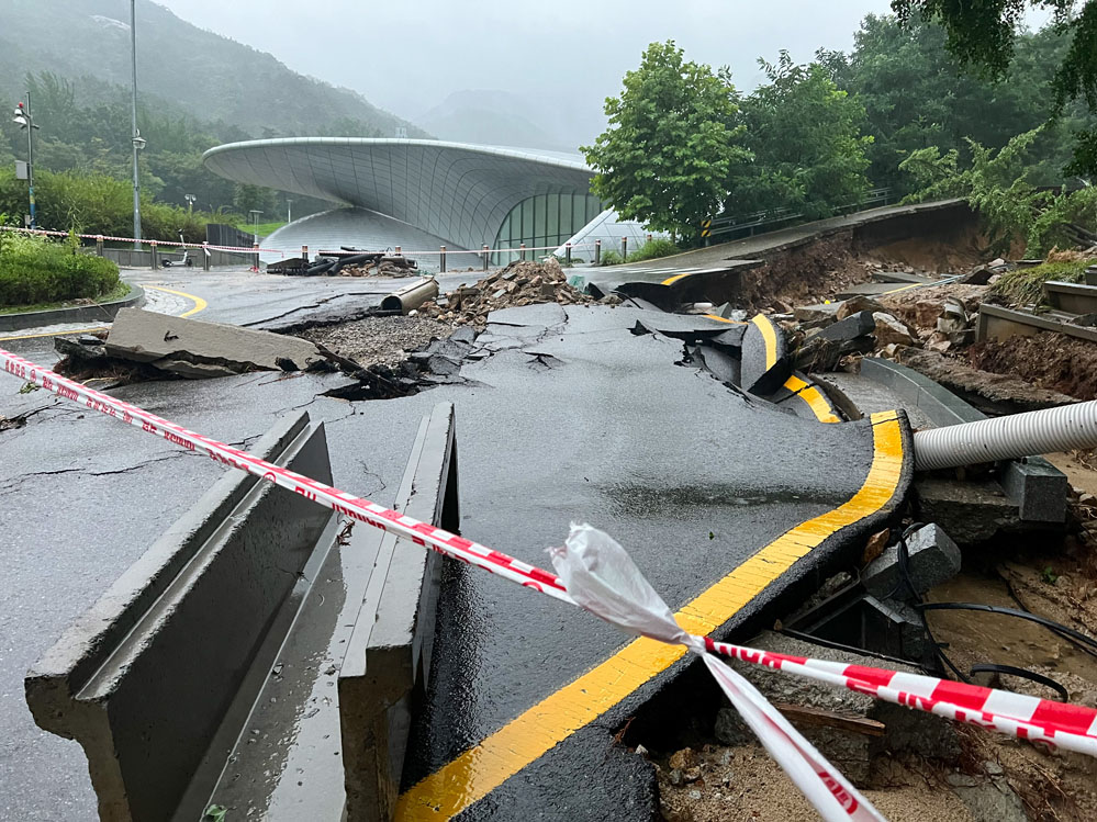 這是8月9日在韓國首爾大學(xué)拍攝的因遭遇強(qiáng)降雨而受損的道路(手機(jī)拍攝)。