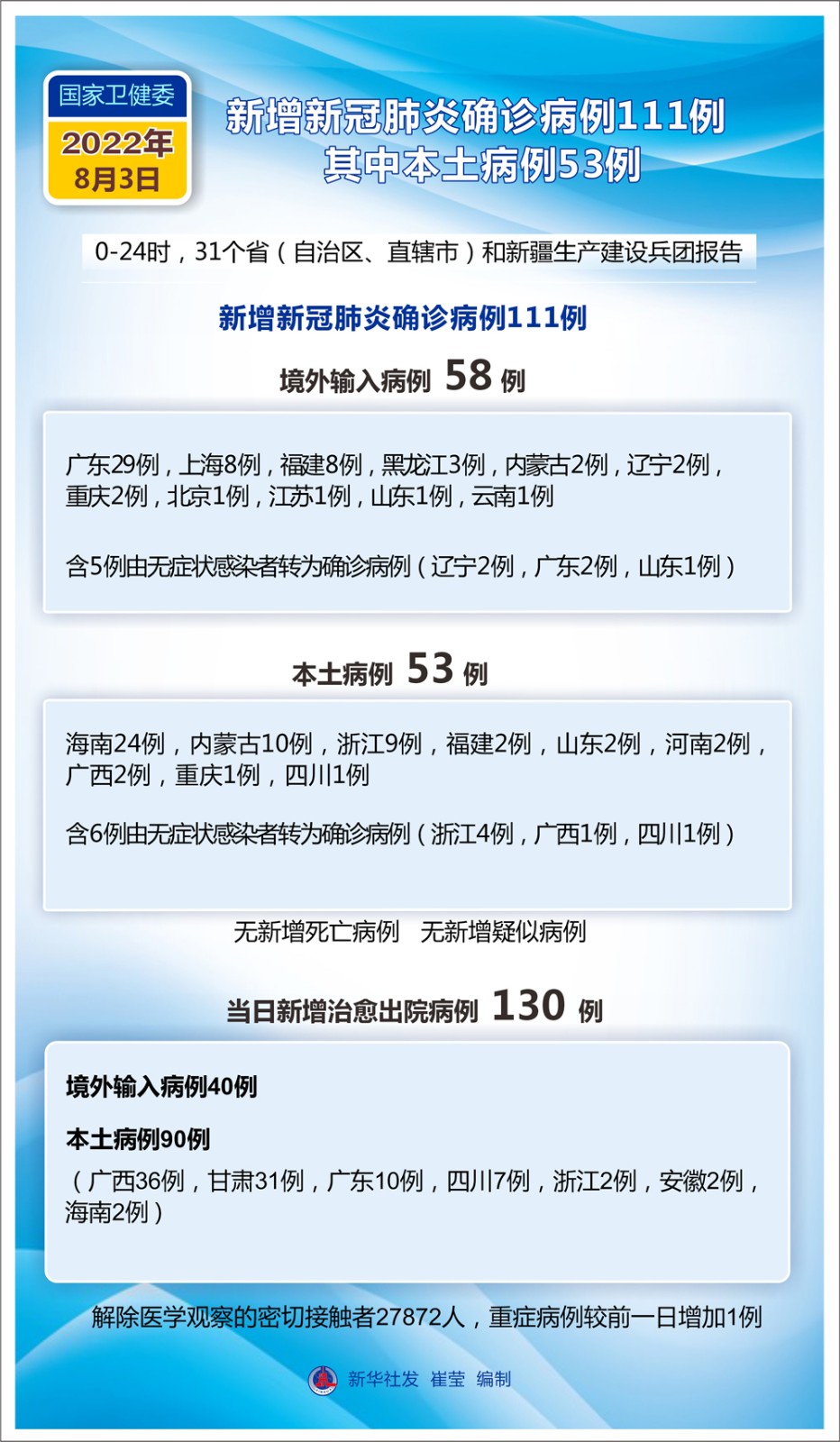 (圖表)國家衛(wèi)健委:8月3日新增新冠肺炎確診病例111例 其中本土病例53例