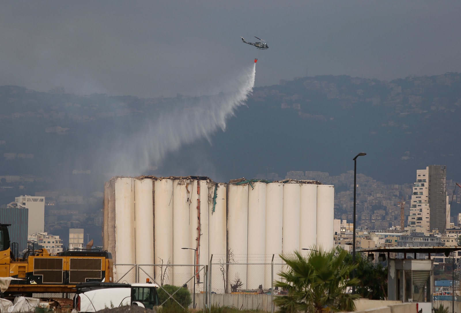 7月31日,在黎巴嫩貝魯特港口,直升機(jī)向部分坍塌的港口糧倉灑水。