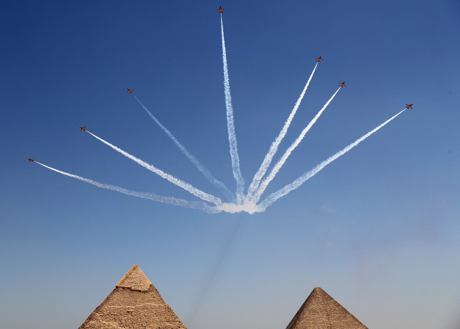當日,埃及2022金字塔航空表演在吉薩金字塔景區(qū)舉行,來自埃及和韓國的多個飛行表演隊伍進行了多項精彩的飛行表演。