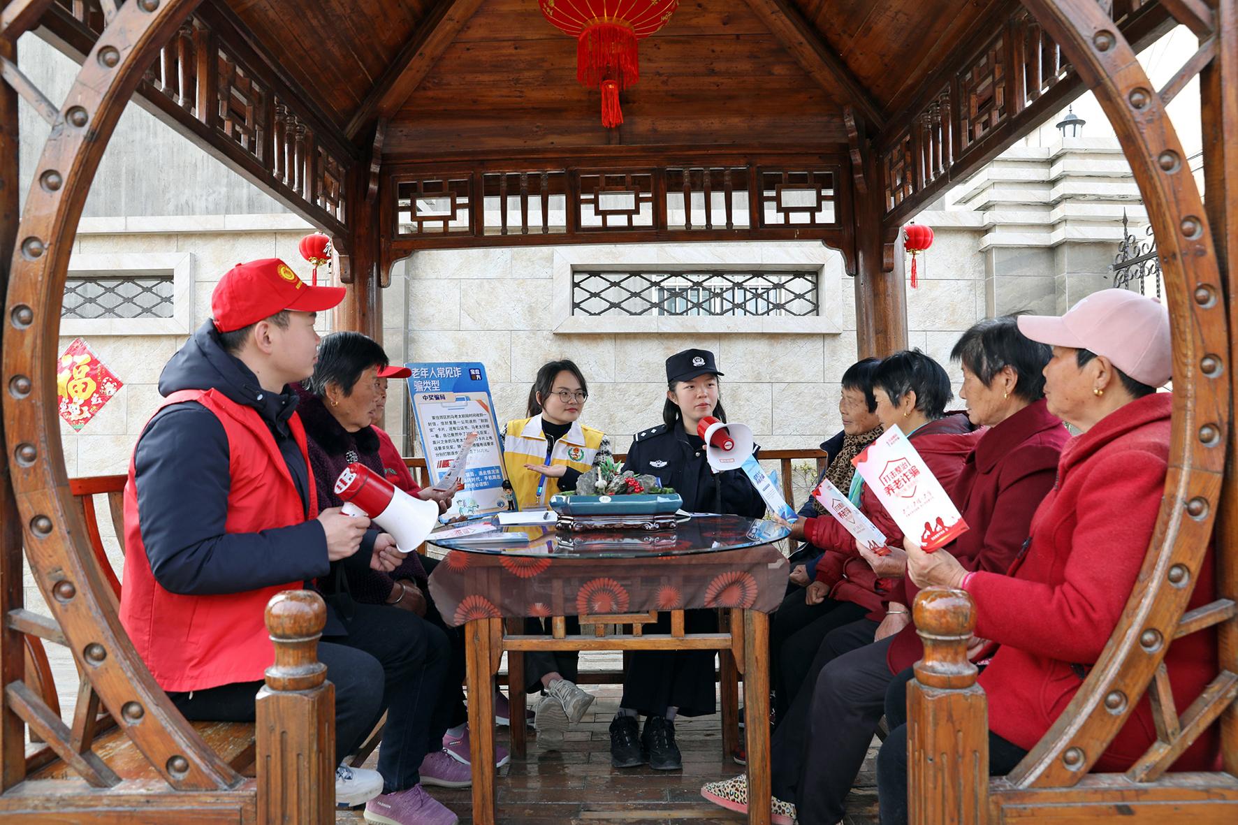 圖為社區(qū)民警和網(wǎng)格員向留守老人宣傳防范養(yǎng)老詐騙知識(shí)。