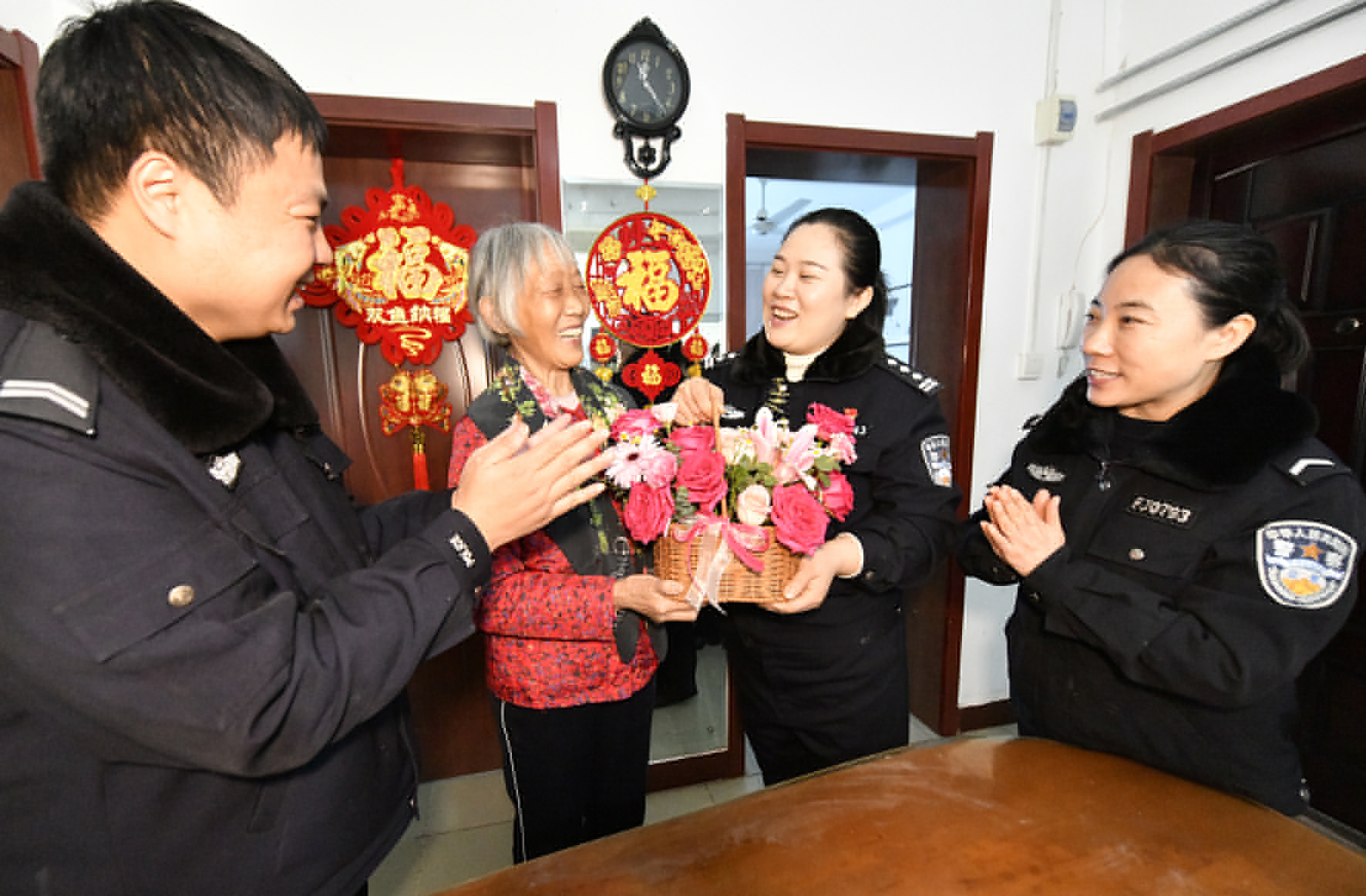 3月7日,河南省鄭州市公安局金水分局巡特警與人民路派出所的民輔警看望81歲的治安先進(jìn)個(gè)人吳大媽,并送上節(jié)日的問候。