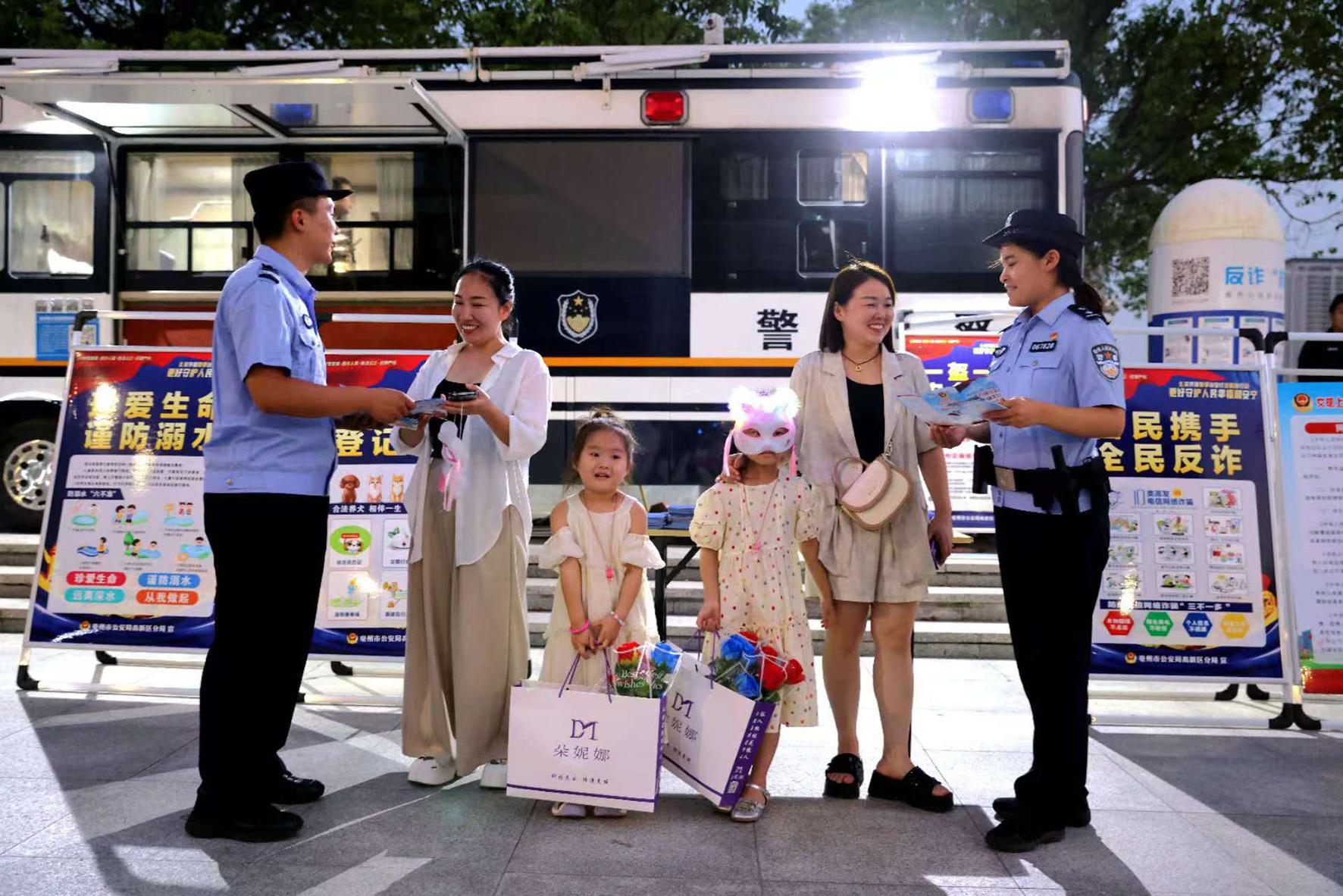 8月11日晚,安徽省當(dāng)涂縣公安局平安小分隊(duì)結(jié)合夏夜治安巡查宣防統(tǒng)一行動(dòng),深入社區(qū)、公園、夜市、廣場(chǎng)和群眾納涼場(chǎng)所等,以群眾“看得見(jiàn)、容易懂、記得住”的方式,開(kāi)展防養(yǎng)老詐騙、防溺水、反傳銷(xiāo)、禁毒等安全知識(shí)宣傳。