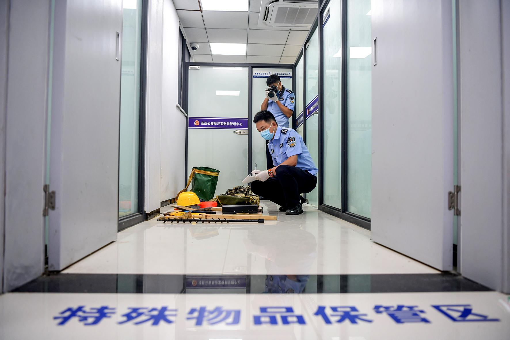 圖為辦案民警對涉案物品進(jìn)行登記入庫保存。