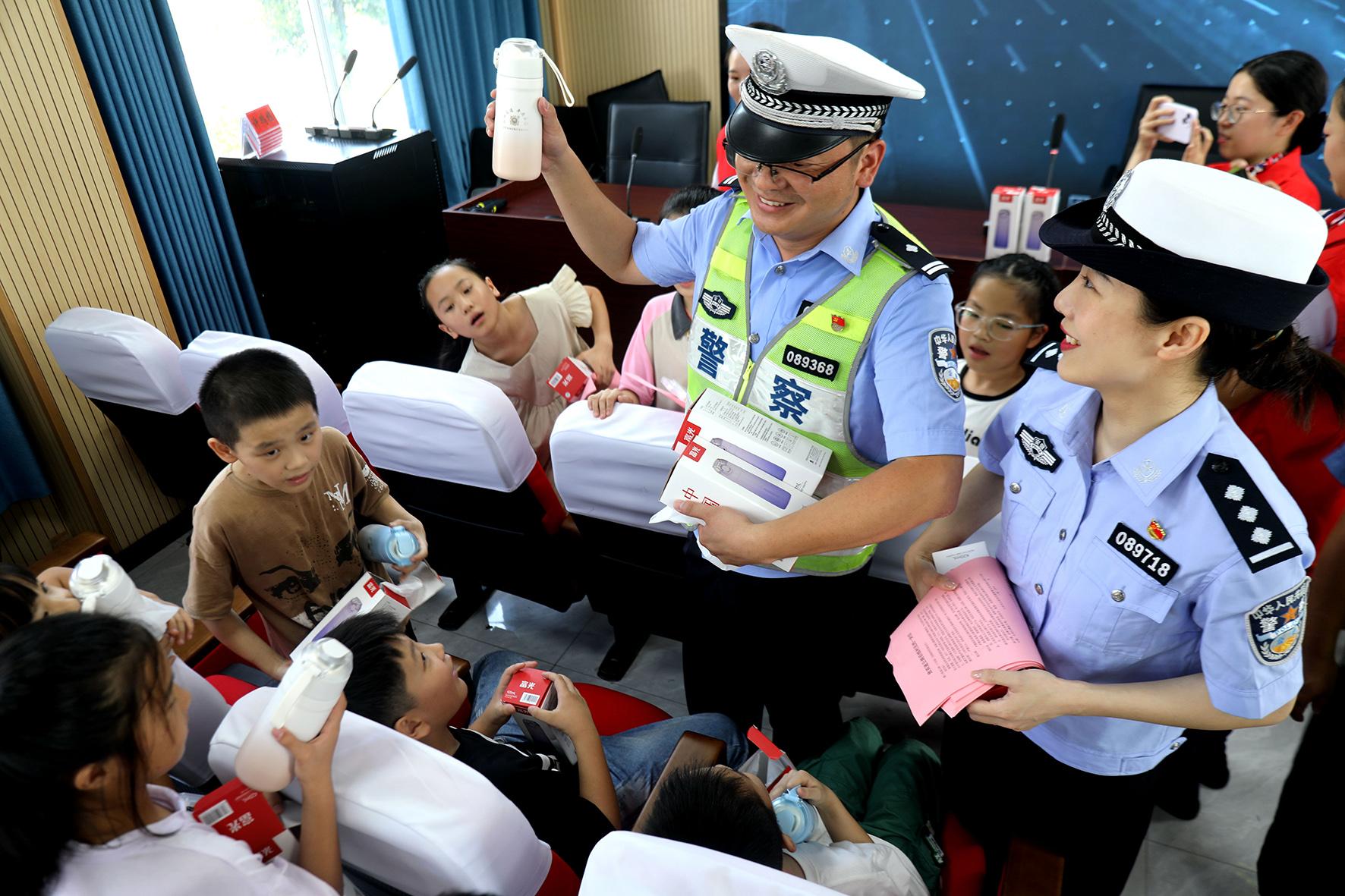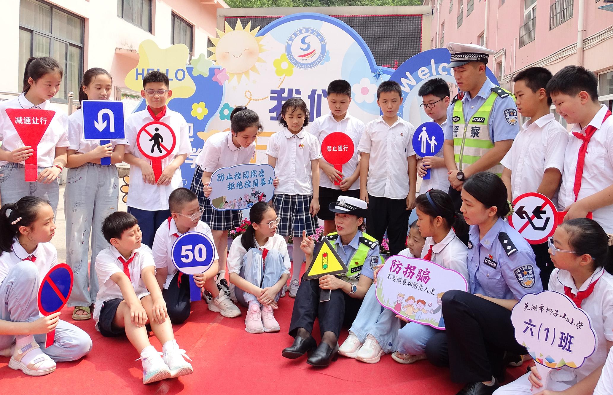 9月2日,安徽省蕪湖市公安局鏡湖分局赭山派出所聯(lián)合鏡湖交警大隊開展“開學(xué)第一課 法治伴‘童’行”活動。