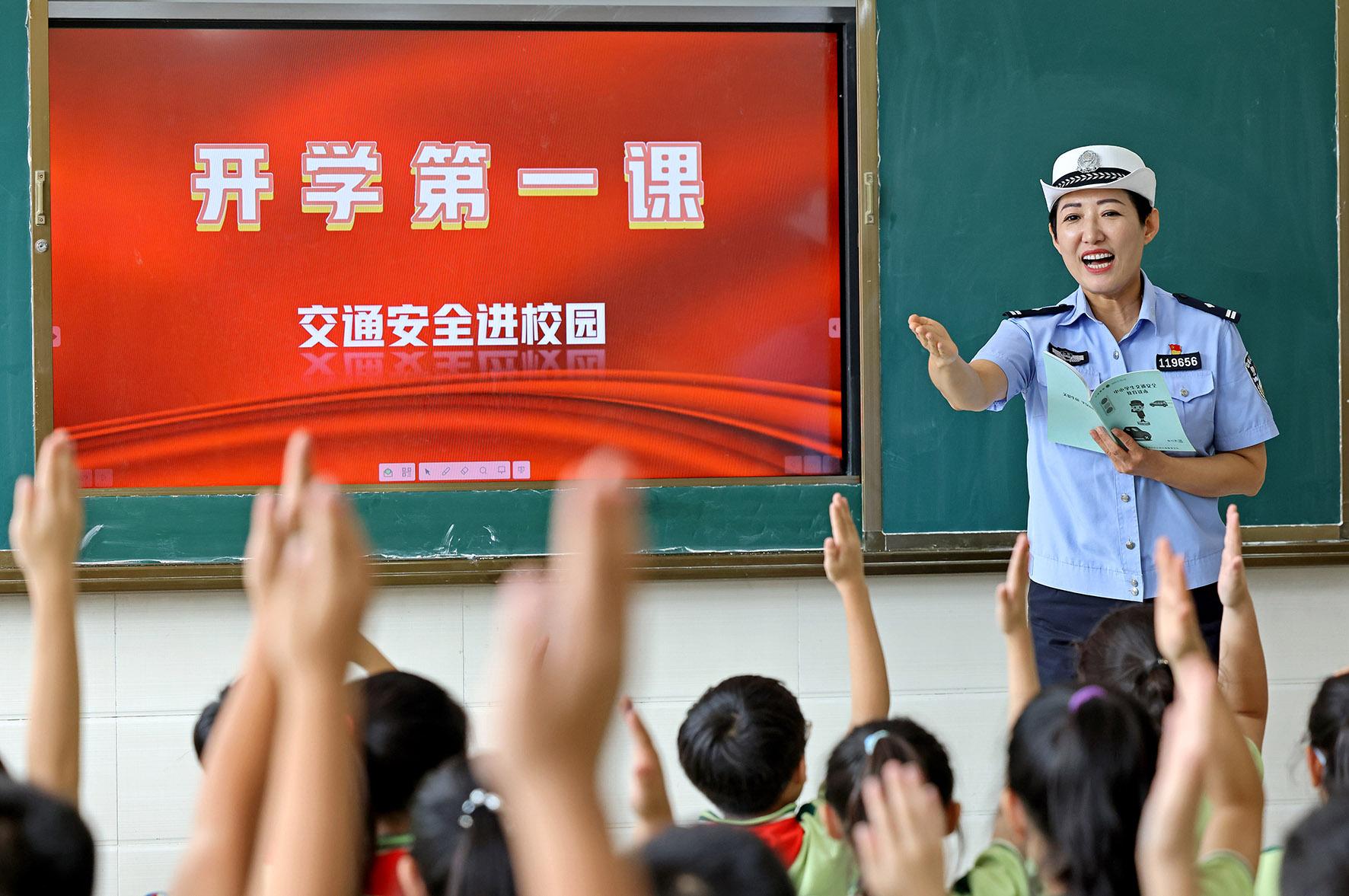 9月2日,安徽省阜南縣公安局交管大隊民輔警走進(jìn)轄區(qū)中小學(xué)校,開展“知危險、避危險”交通安全開學(xué)第一課活動。