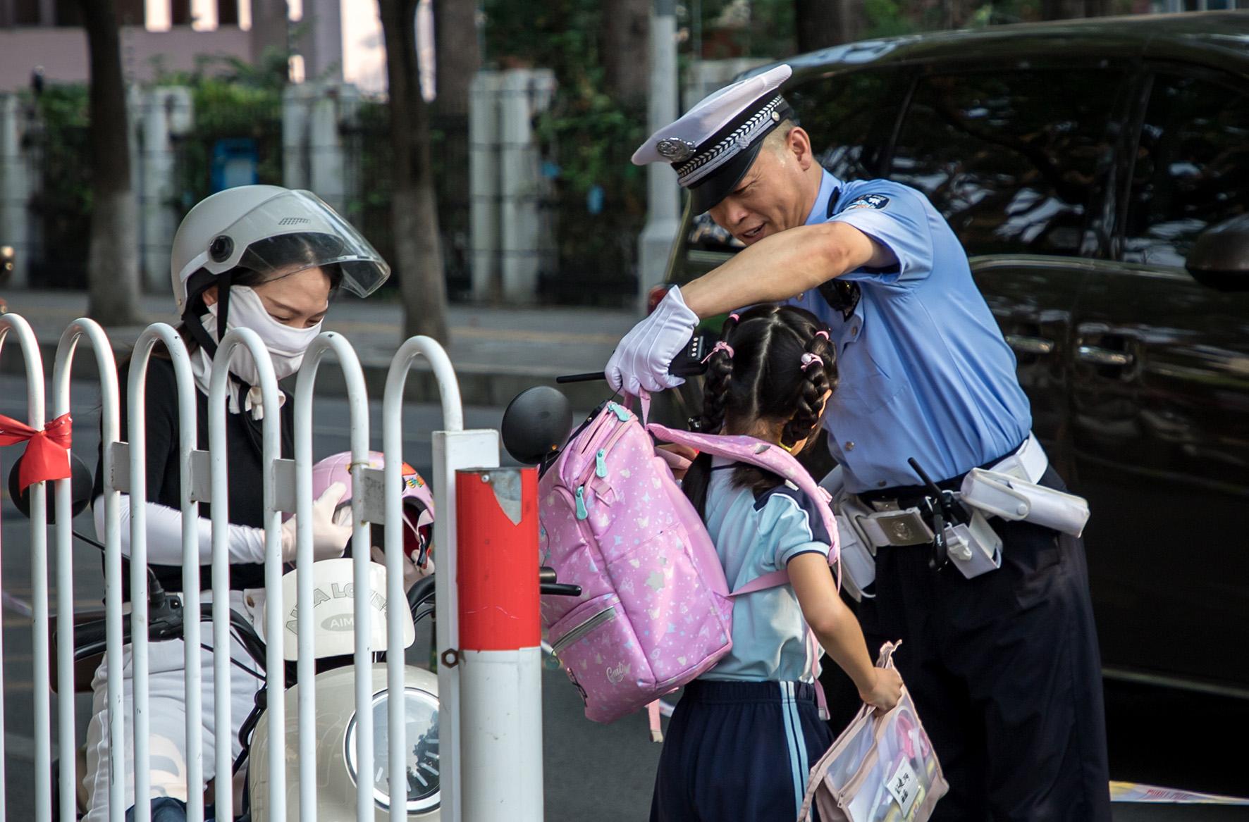 9月2日,安徽省當(dāng)涂縣公安局交管大隊民警正在校園周邊維護(hù)交通秩序,護(hù)送孩子們平安進(jìn)校園。