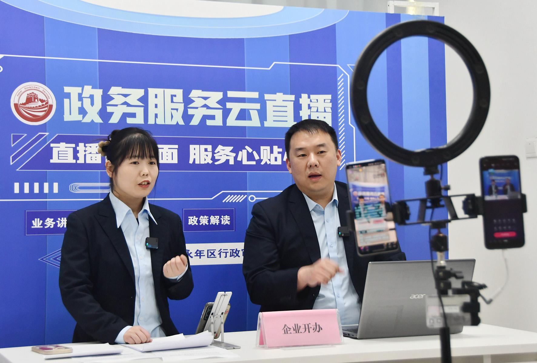 圖為3月25日,工作人員在永年區(qū)政務(wù)服務(wù)中心通過直播的方式講解企業(yè)開辦網(wǎng)上辦理步驟。