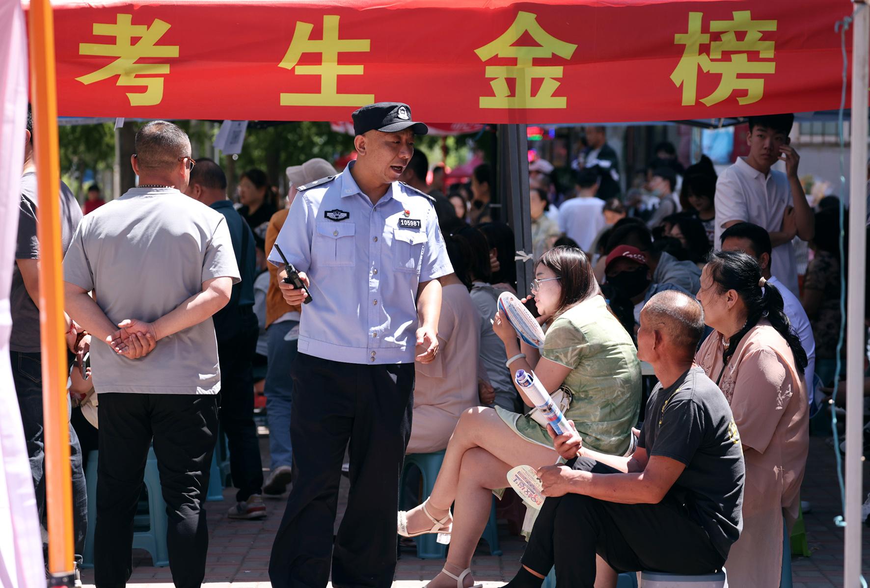 6月7日,在山東省實(shí)驗(yàn)中學(xué)考點(diǎn),濟(jì)南市公安局市中區(qū)分局桿石橋派出所執(zhí)勤民警引導(dǎo)考生有序進(jìn)場(chǎng)。