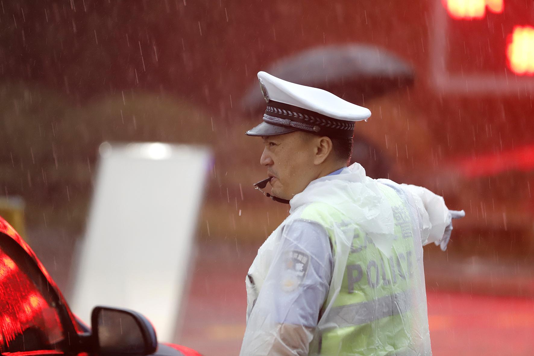 6月8日,江西省九江市公安局潯陽(yáng)分局民輔警冒雨在九江市三中考點(diǎn)指揮疏導(dǎo)交通。