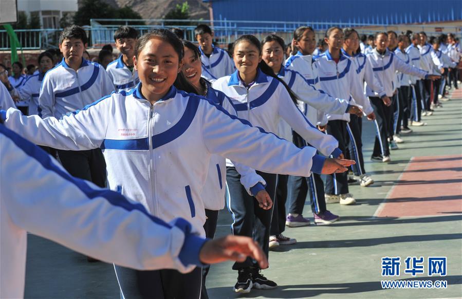 西藏昌都市芒康縣鹽井中學(xué)學(xué)生課間在操場(chǎng)跳弦子操(6月6日攝)。新華社記者 晉美多吉 攝