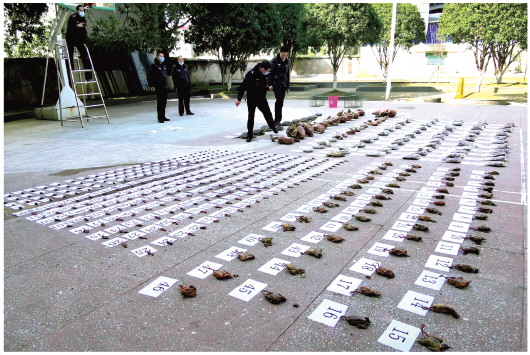 ▲ 1月23日至2月28日,湖南省森林公安機關共辦理涉及野生動物的刑事案件93起,抓獲犯罪嫌疑人97名,收繳野生動物5606頭(只)。圖為民警在清理繳獲的竹鼠、野豬、斑鳩等野生動物尸體。 本報記者 阮占江 本報通訊員 顏英華 攝
