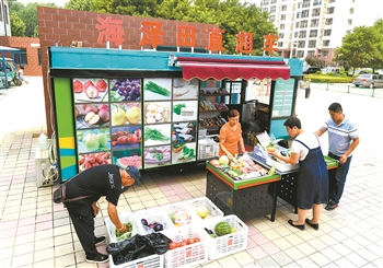 6月28日,河北省永清縣御景灣社區(qū)居民在便民“直超車”購(gòu)買新鮮果蔬。