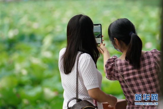 8月11日,游人在武漢東湖風(fēng)景區(qū)拍照游覽。 新華社記者 馮國棟 攝