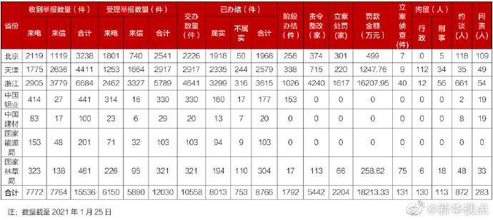 生態(tài)環(huán)境部29日通報(bào),截至2021年1月25日,第二輪第二批中央生態(tài)環(huán)保督察受理的群眾舉報(bào)已辦結(jié)8766件,處罰金額約18213.33萬(wàn)元,立案?jìng)刹?31件,行政拘留130人,刑事拘留113人,約談872人,問(wèn)責(zé)283人。(記者高敬,圖片來(lái)源:生態(tài)環(huán)境部)