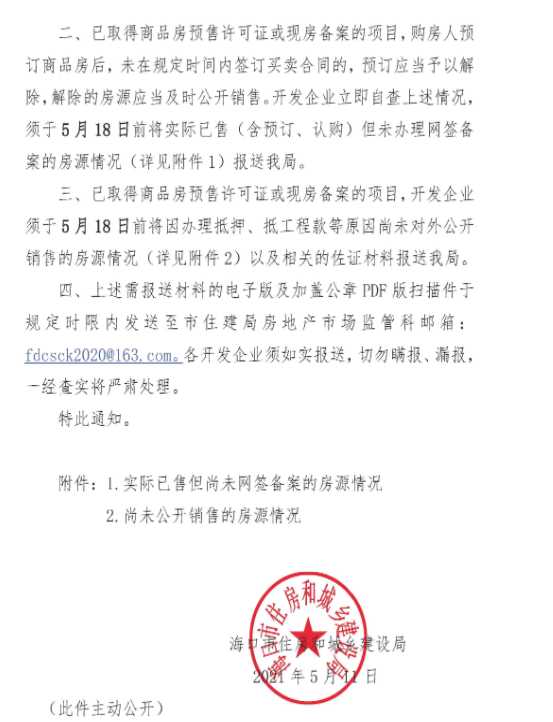 近日,海南省??谑凶》亢统青l(xiāng)建設(shè)局發(fā)布《關(guān)于清理房地產(chǎn)開(kāi)發(fā)項(xiàng)目可售房源的通知》。
