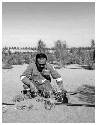 圖為阿克蘇地區(qū)的護(hù)林員在沙漠檢查滴灌線路。