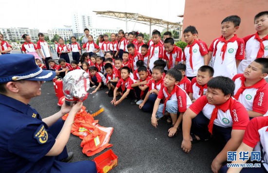6月15日,在湖南省資興市第二完全小學(xué),消防員在向?qū)W生介紹防毒面具。