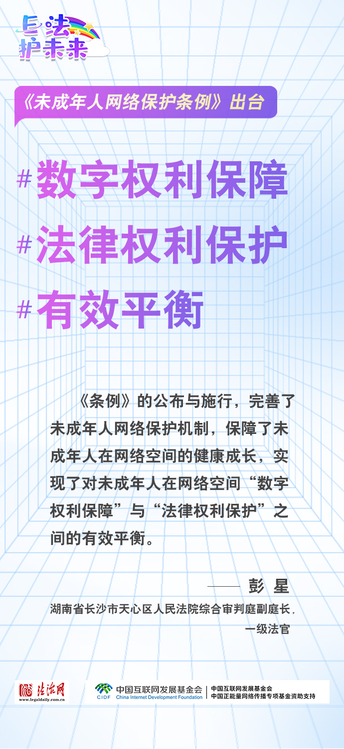 法治網(wǎng)特推出一組“專家有言”海報,內(nèi)容涵蓋《條例》出臺的現(xiàn)實意義和時代價值、網(wǎng)絡素養(yǎng)促進、網(wǎng)絡信息內(nèi)容規(guī)范、個人信息網(wǎng)絡保護、網(wǎng)絡沉迷防治等,充分展現(xiàn)《條例》的出臺是我國互聯(lián)網(wǎng)治理領(lǐng)域的法治成果,彰顯中國在未成年人網(wǎng)絡保護領(lǐng)域的擔當,為全球未成年人網(wǎng)絡空間治理提供指引和樣本。