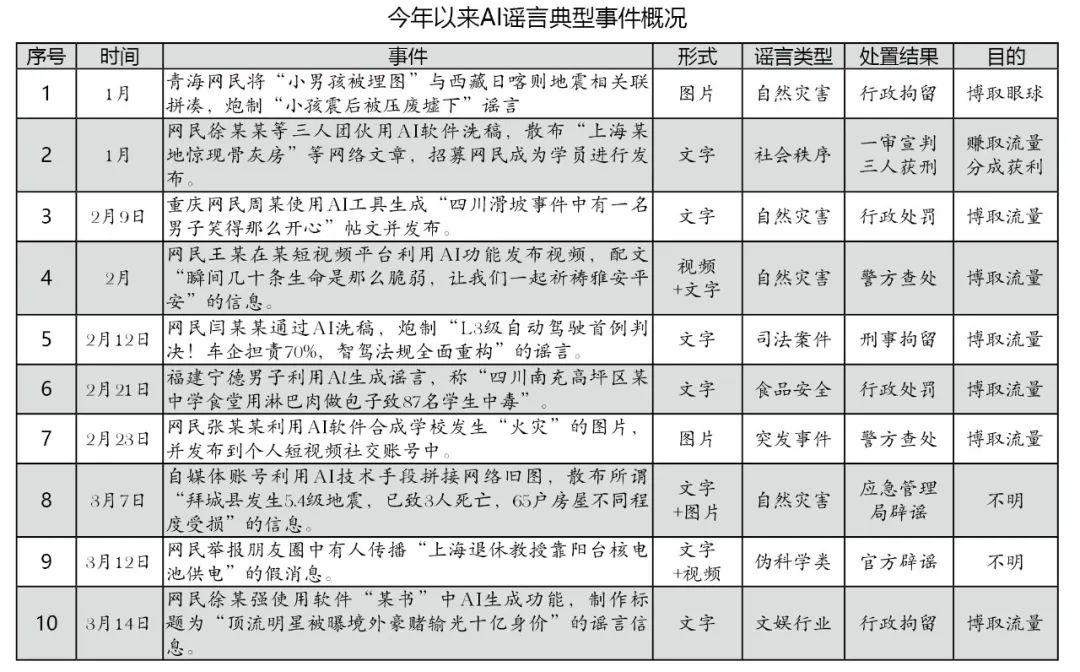 10起典型案例中,有4起AI謠言與自然災(zāi)害相關(guān),包括地震、山體滑坡等;2起謠言涉及食品安全和突發(fā)事件,分別為“四川某中學(xué)食堂用淋巴肉做包子致87名學(xué)生中毒”和“某地學(xué)校發(fā)生火災(zāi)”;還有4起謠言分別涉及偽科學(xué)、文娛行業(yè)、社會秩序和司法案件四個方面。AI謠言表現(xiàn)形式較多,大多通過微博、微信、短視頻等社交媒體渠道擴散,并以文字、圖片、視頻形式單一或“搭配”傳播,比如“西藏定日縣地震一小孩被壓廢墟”謠言形式為圖片,“上海退休教授靠陽臺核電池供電”謠言則是以“文字+視頻”的形式傳播。造謠動機方面,有8起事件明確提到造謠者是為了蹭熱點、賺取流量收益,可見流量經(jīng)濟仍然是AI謠言存在的底層邏輯。10起事件中,有2起事件被官方辟謠,但沒有其他情況通報,其余8起均有明確處理結(jié)果。處置結(jié)果方面,10起事件中有5起事件的造謠者被公安機關(guān)給予行政處罰或行政拘留,有2起事件進入到司法流程,網(wǎng)民閆某某因刻意炒作“國內(nèi)首例智能駕駛致死案”,被屬地警方刑事拘留;網(wǎng)民徐某某等3人散布“上海某地驚現(xiàn)骨灰房”等謠言,獲利數(shù)額較大,被上海當(dāng)?shù)胤ㄔ阂苑欠ń?jīng)營罪判處有期徒刑一年十個月不等。